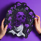 Inspired by the complexity of the human mind and the tension between darkness and beauty, our Skull Rising from Female Face Patch captures the struggle of thoughts that obscure the light of life. The skull tearing from the face symbolizes the obsession of human thought with bad and dark thoughts that prevent us from seeing the beauty in life. The delicate flowers surrounding the skull and face represent the life and beauty we fail to notice because our minds are consumed by darkness.