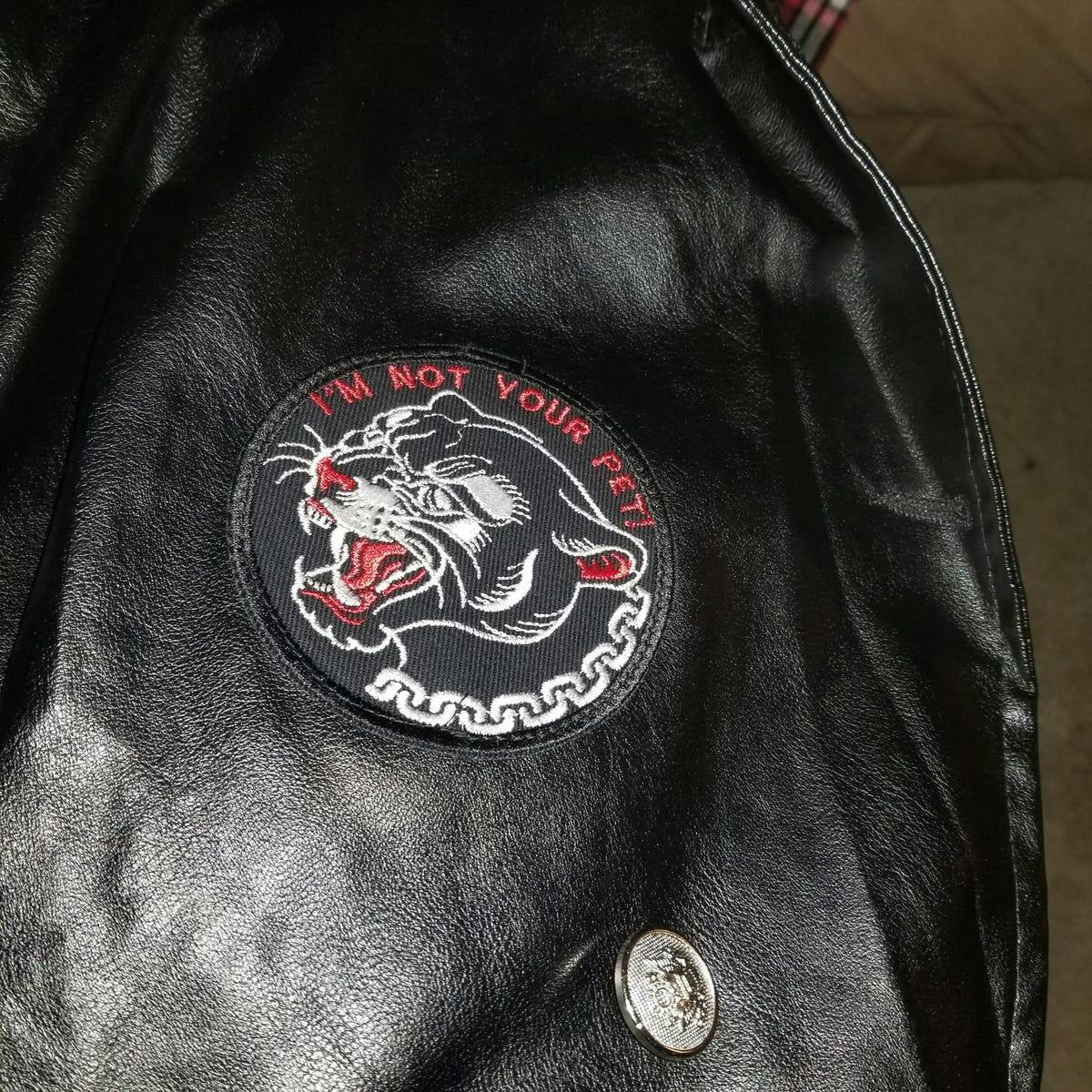 Make a bold statement with this highly detailed embroidered patch featuring a fierce panther with a chain around its neck, designed in striking old-fashioned tattoo style. The powerful quote “I’m Not Your Pet” adds meaning beyond fashion—symbolizing resistance against the growing trend of keeping exotic animals as pets and confining them to unnatural environments.