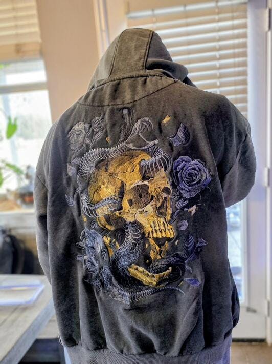 Summon your dark side with our Embroidered Gold Skull Hoodie, featuring a striking gold skull entwined with a snake skeleton and surrounded by grey roses. Designed for fans of gothic fashion, heavy metal, and macabre aesthetics, this hoodie combines bold artistry with raw, edgy style.