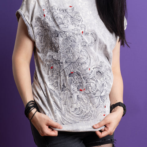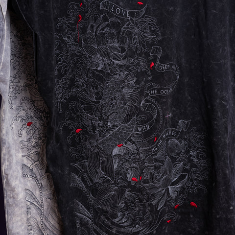 Dive into tradition with this embroidered t-shirt showcasing a stunning koi fish and dynamic waves rendered in classic Japanese tattoo style. Inspired by the timeless art of Irezumi, the design symbolizes perseverance, strength, and transformation—hallmarks of the koi legend of swimming upstream against adversity. The acid-washed, soft-washed fabric offers a uniquely worn-in feel, enhanced by a garment dye technique that makes each shirt truly one-of-a-kind with no two exactly alike. A perfect blend of heritage and comfort for those who appreciate bold art with meaning.